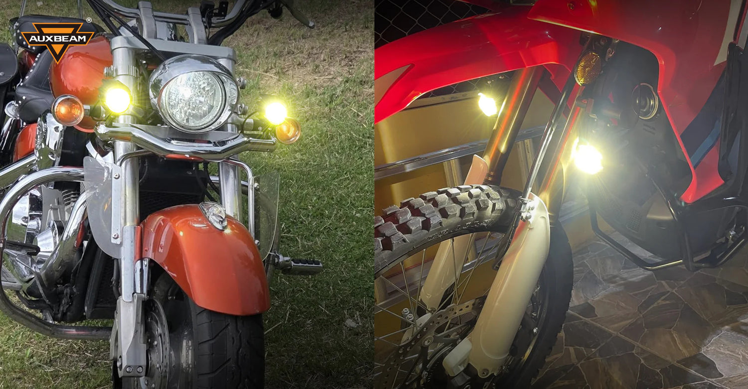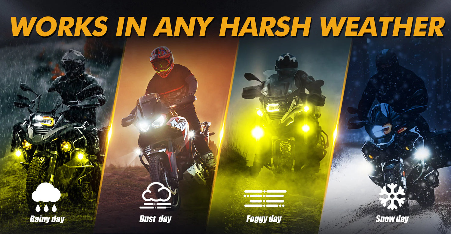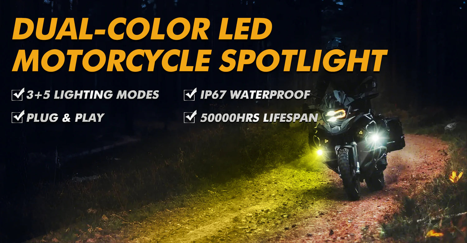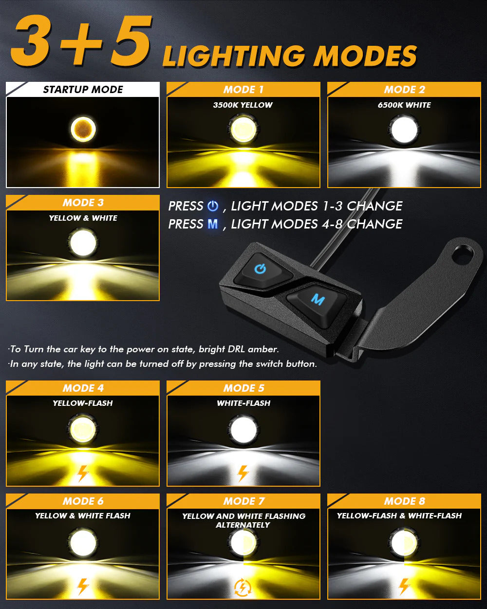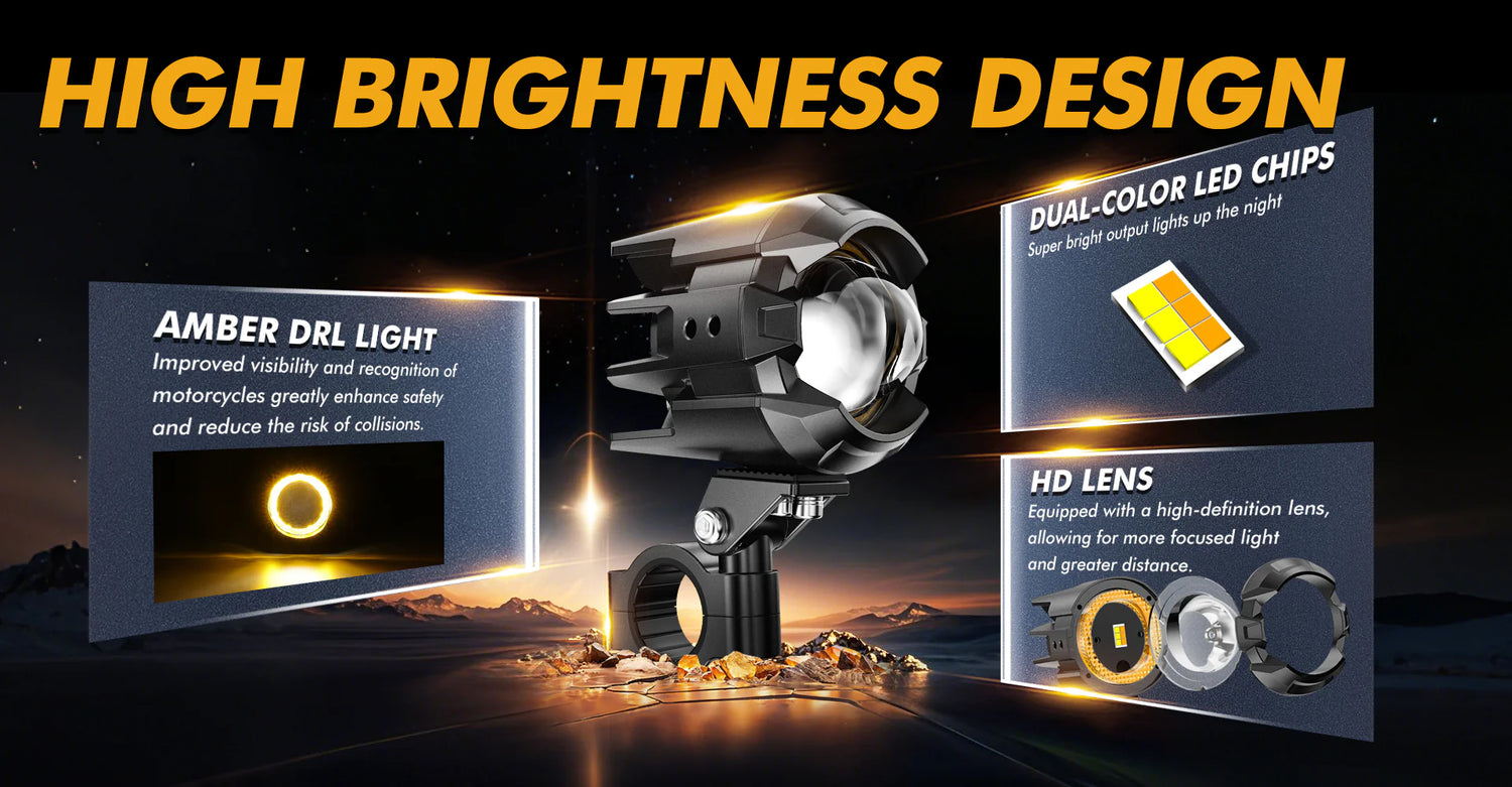 - The dual-color LED motorcycle spotlight has 3 main lighting modes: DRL(amber)、always-on mode, and flashing mode.