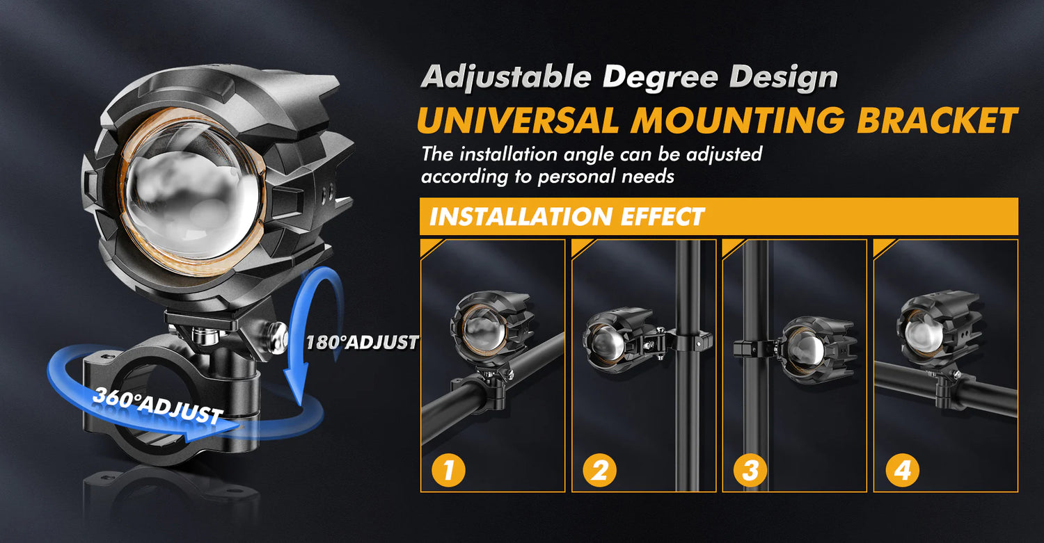 - This motorcycle spotlight comes with a universal bracket that can rotate 360 degrees, is made of aviation-grade aluminum, has high-strength shock resistance, is not easy to break, is strong and durable, and you can easily install it on your own vehicle.